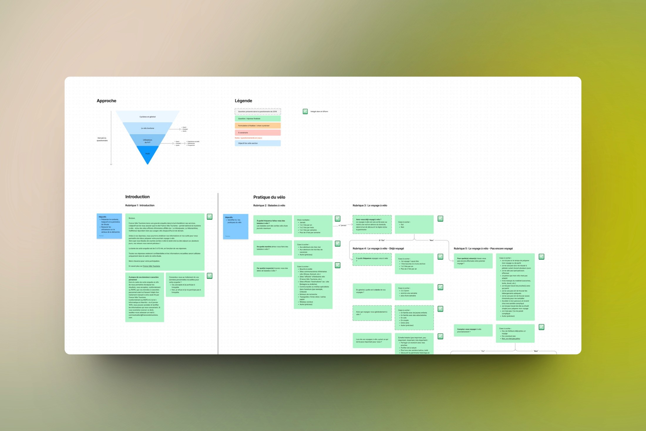 Le questionnaire était long, mais conçu en entonnoir de manière à ce que les participant.e.s les plus éloignés de France Vélo Tourisme puissent malgré tout y répondre :