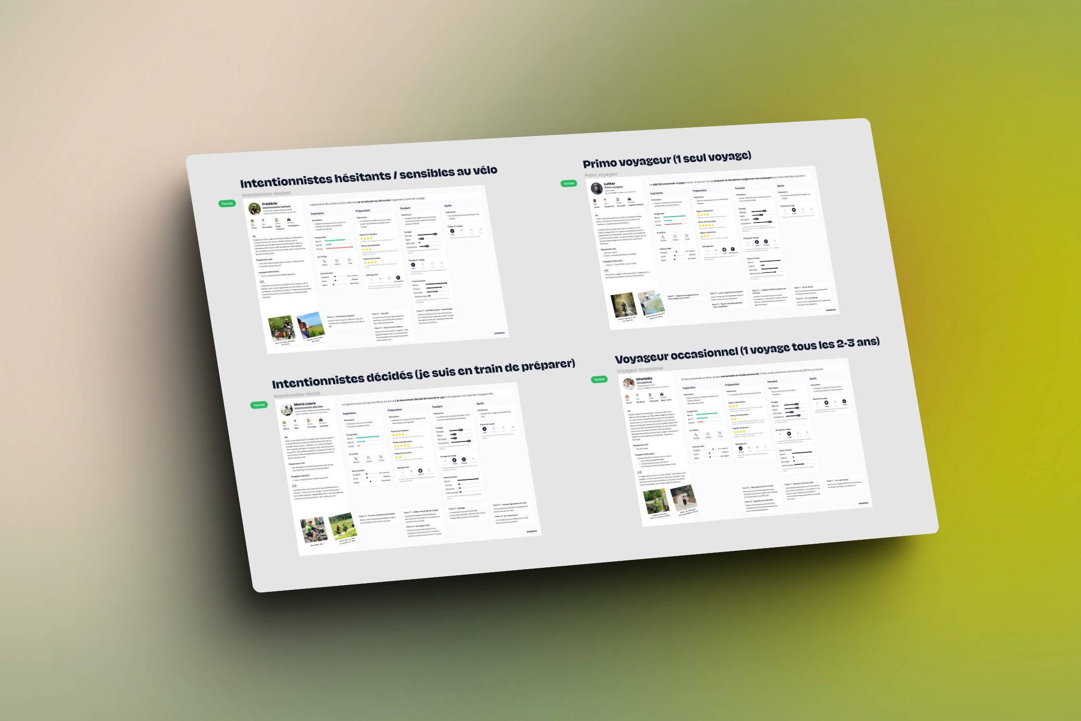 J’ai également créé des personas, qui se sont révélés être le format de livrable idéal pour permettre à mes interlocuteurs France Vélo Tourisme de diffuser la synthèse de la mission au reste de l’équipe et plus largement aux partenaires et financeurs de l’association.