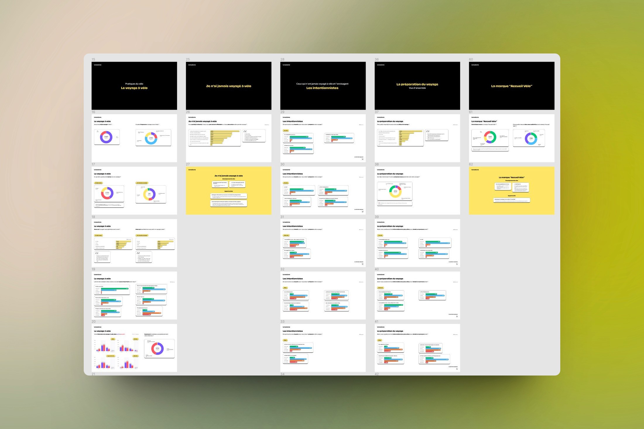 Une fois les données quantitatives et qualitatives croisées et analysées, j’ai réalisé un livrable présentant factuellement les données collectées et des slides d’analyse. Ainsi, si mon analyse est remise en cause, discutée, nuancée, les données “brutes” restent accessibles.